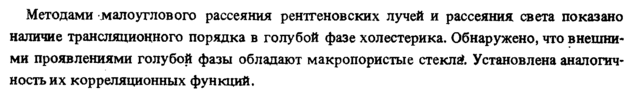 Методами мало углов ого рассеяния рентгеновских лучей и рассеяния света показано наличие трансляционного порядка в голубой фазе холестерика. Обнаружено, что внешними проявлениями голубой фазы обладают макропористые стекла?. Установлена аналогичность их корреляционных функций.