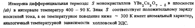 Измерена дифференциальная термоэдс S монокристаллов УВа2Си30? _ δ в плоскости (аЬ) в интервале температур 400 90 К. Знак S соответствует положительному заряду носителей тока, а ее температурное поведение ниже ~ 300 К имеет аномальный характер, аналогичный температурной зависимости холловской ЭДС,