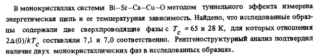 В монокристаллах системы Bi-Sr-Ca-Cu-Ο методом туннельного эффекта измерена энергетическая щель и ее температурная зависимость. Найдено, что исследованные образцы содержали две сверхпроводящие фазы с Тс = 65 и 28 К, для которых отношения 2А(0)!кТ составляли 7,1 и 7,0 соответственно. Рентгеноструктурный анализ подтвердил наличие двух монокристаллических фаз в исследованных образцах.