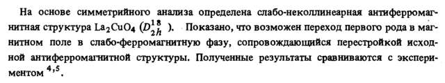 На основе симметрийного анализа определена слабо-неколлинеарная антиферромагнитная структура La3Cu04 (Z)*/| )♦ Показано, что возможен переход первого рода в магнитном поле в слабо-ферромагнитную фазу, сопровождающийся перестройкой исходной антиферромагнитной структуры. Полученные результаты сравниваются с экспери4,5 ментом ' .
