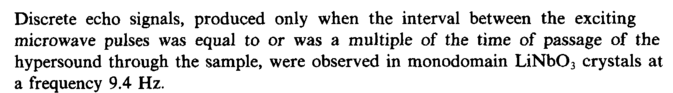 Discrete echo signals, produced only when the interval between the exciting microwave pulses was equal to or was a multiple of the time of passage of the hypersound through the sample, were observed in monodomain LiNb03 crystals at a frequency 9.4 Hz.
