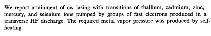 We report attainment of cw lasing with transitions of thallium, cadmium, zinc, mercury, and selenium ions pumped by groups of fast electrons produced in a transverse HF discharge. The required metal vapor pressure was produced by self-heating.