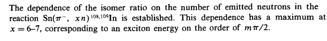 The dependence of the isomer ratio on the number of emitted neutrons in the reaction Sn(7r~, xn)1081MIn is established. This dependence has a maximum at x = 6-7, corresponding to an exciton energy on the order of mir/2.