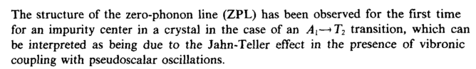 The structure of the zero-phonon line (ZPL) has been observed for the first time for an impurity center in a crystal in the case of an Al—>T2 transition, which can be interpreted as being due to the Jahn-Teller effect in the presence of vibronic coupling with pseudoscalar oscillations.