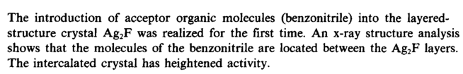 The introduction of acceptor organic molecules (benzonitrile) into the layered-structure crystal Ag2F was realized for the first time. An x-ray structure analysis shows that the molecules of the benzonitrile are located between the Ag2F layers. The intercalated crystal has heightened activity.
