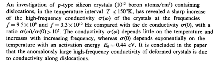 An investigation of p-type silicon crystals (1013 boron atoms/cm3) containing dislocations, in the temperature interval Τ < 150°K, has revealed a sharp increase of the high-frequency conductivity σ(ω) of the crystals at the frequencies / = 9.5 Χ109 and /= 3.3 Χ1010 Hz compared with the dc conductivity σ(0), with a ratio ο-(ω)/ο-(0)> 107. The conductivity σ(ω) depends little on the temperature and increases with increasing frequency, whereas o-(0) depends exponentially on the temperature with an activation energy E0 = 0.44 eV. It is concluded in the paper that the anomalously large high-frequency conductivity of deformed crystals is due to conductivity along dislocations.