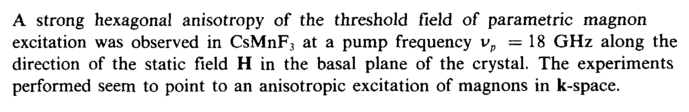A strong hexagonal anisotropy of the threshold field of parametric magnon excitation was observed in CsMnF3 at a pump frequency vp = 18 GHz along the direction of the static field Η in the basal plane of the crystal. The experiments performed seem to point to an anisotropic excitation of magnons in k-space.