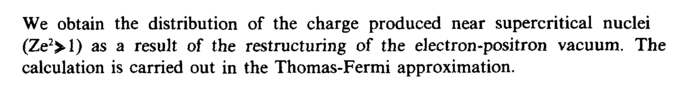 We obtain the distribution of the charge produced near supercritical nuclei (Ze2>l) as a result of the restructuring of the electron-positron vacuum. The calculation is carried out in the Thomas-Fermi approximation.