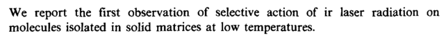 We report the first observation of selective action of ir laser radiation on molecules isolated in solid matrices at low temperatures.