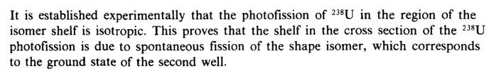 It is established experimentally that the photofission of 238U in the region of the isomer shelf is isotropic. This proves that the shelf in the cross section of the 238U photofission is due to spontaneous fission of the shape isomer, which corresponds to the ground state of the second well.