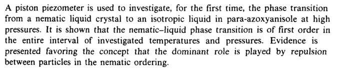 A piston piezometer is used to investigate, for the first time, the phase transition from a nematic liquid crystal to an isotropic liquid in para-azoxyanisole at high pressures. It is shown that the nematic-liquid phase transition is of first order in the entire interval of investigated temperatures and pressures. Evidence is presented favoring the concept that the dominant role is played by repulsion between particles in the nematic ordering.
