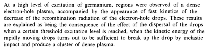 At a high level of excitation of germanium, regions were observed of a dense electron-hole plasma, accompanied by the appearance of fast kinetics of the decrease of the recombination radiation of the electron-hole drops. These results are explained as being the consequence of the effect of the dispersal of the drops when a certain threshold excitation level is reached, when the kinetic energy of the rapidly moving drops turns out to be sufficient to break up the drop by inelastic impact and produce a cluster of dense plasma.