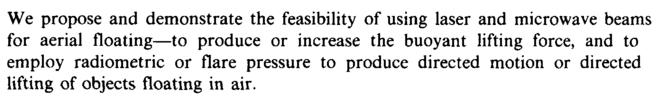 We propose and demonstrate the feasibility of using laser and microwave beams for aerial floating—to produce or increase the buoyant lifting force, and to employ radiometric or flare pressure to produce directed motion or directed lifting of objects floating in air.