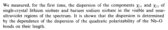 We measured, for the first time, the dispersion of the components χ3, and χη of single-crystal lithium niobate and barium sodium niobate in the visible and near-ultraviolet regions of the spectrum. It is shown that the dispersion is determined by the dependence of the dispersion of the quadratic polarizability of the Nb-O bonds on their length.