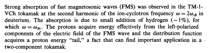 Strong absorption of fast magnetosonic waves (FMS) was observed in the TM-1-VCh tokamak at the second harmonic of the ion-cyclotron frequency ω = 2ωίΒ in deuterium. The absorption is due to small addition of hydrogen (~1%), for which ω = ωΒί. The protons acquire energy effectively from the left-polarized components of the electric field of the FMS wave and the distribution function acquires a proton energy "tail," a fact that can find important application in a two-component tokamak.