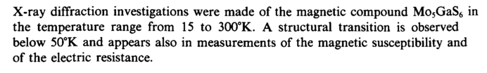 X-ray diffraction investigations were made of the magnetic compound Mo5GaS6 in the temperature range from 15 to 300°K. A structural transition is observed below 50°K and appears also in measurements of the magnetic susceptibility and of the electric resistance.
