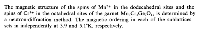 The magnetic structure of the spins of Mn2+ in the dodecahedral sites and the spins of Cr3+ in the octahedral sites of the garnet íÐÚóÇ20ÅÚ012 is determined by a neutron-diffraction method. The magnetic ordering in each of the sublattices sets in independently at 3.9 and 5.çë, respectively.
