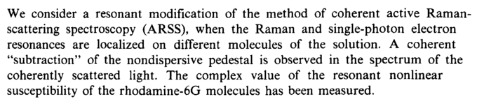 We consider a resonant modification of the method of coherent active Raman-scattering spectroscopy (ARSS), when the Raman and single-photon electron resonances are localized on different molecules of the solution. A coherent "subtraction" of the nondispersive pedestal is observed in the spectrum of the coherently scattered light. The complex value of the resonant nonlinear susceptibility of the rhodamine-6G molecules has been measured.