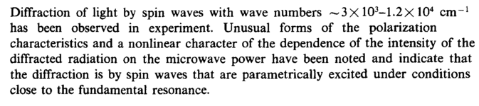 Diffraction of light by spin waves with wave numbers ~3X 103-1.2χ 104 cm-1 has been observed in experiment. Unusual forms of the polarization characteristics and a nonlinear character of the dependence of the intensity of the diffracted radiation on the microwave power have been noted and indicate that the diffraction is by spin waves that are parametrically excited under conditions close to the fundamental resonance.