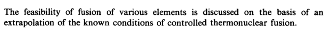 The feasibility of fusion of various elements is discussed on the basis of an extrapolation of the known conditions of controlled thermonuclear fusion.