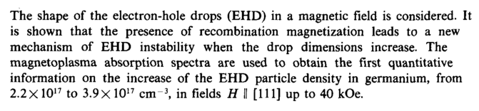 The shape of the electron-hole drops (EHD) in a magnetic field is considered. It is shown that the presence of recombination magnetization leads to a new mechanism of EHD instability when the drop dimensions increase. The magnetoplasma absorption spectra are used to obtain the first quantitative information on the increase of the EHD particle density in germanium, from 2.2Χ 1017 to 3.9X 10" cm-1, in fields Η II [111] up to 40 kOe.