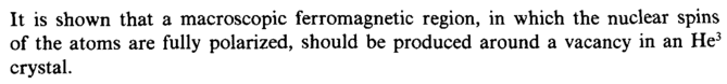 It is shown that a macroscopic ferromagnetic region, in which the nuclear spins of the atoms are fully polarized, should be produced around a vacancy in an He