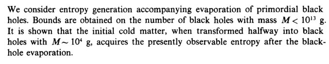 We consider entropy generation accompanying evaporation of primordial black holes. Bounds are obtained on the number of black holes with mass Μ < 1013 g. It is shown that the initial cold matter, when transformed halfway into black holes with M~ 10" g, acquires the presently observable entropy after the black-hole evaporation.
