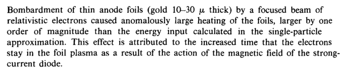 Bombardment of thin anode foils (gold 10-30 μ thick) by a focused beam of relativistic electrons caused anomalously large heating of the foils, larger by one order of magnitude than the energy input calculated in the single-particle approximation. This effect is attributed to the increased time that the electrons stay in the foil plasma as a result of the action of the magnetic field of the strong-current diode.
