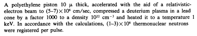 A polyethylene piston 10 μ thick, accelerated with the aid of a relativistic-electron beam to (5-7) Χ 106 cm/sec, compressed a deuterium plasma in a lead cone by a factor 1000 to a density 1022 cm-3 and heated it to a temperature 1 keV. In accordance with the calculations, (1-3)X106 thermonuclear neutrons were registered per pulse.