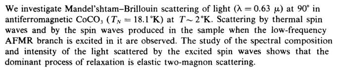 We investigate Mandel'shtam-Brillouin scattering of light (λ = 0.63 μ) at 90° in antiferromagnetic CoCOj (TN = 18.ΓΚ) at T~2°K. Scattering by thermal spin waves and by the spin waves produced in the sample when the low-frequency AFMR branch is excited in it are observed. The study of the spectral composition and intensity of the light scattered by the excited spin waves shows that the dominant process of relaxation is elastic two-magnon scattering.