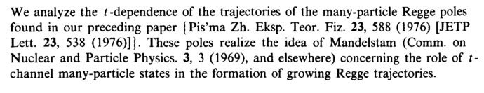 We analyze the t -dependence of the trajectories of the many-particle Regge poles found in our preceding paper jPis'ma Zh. Eksp. Teor. Fiz. 23, 588 (1976) [JETP Lett. 23, 538 (1976)] j. These poles realize the idea of Mandelstam (Comm. on Nuclear and Particle Physics. 3, 3 (1969), and elsewhere) concerning the role of t channel many-particle states in the formation of growing Regge trajectories.