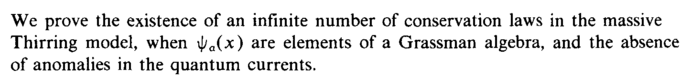 We prove the existence of an infinite number of conservation laws in the massive Thirring model, when ψα(χ) are elements of a Grassman algebra, and the absence of anomalies in the quantum currents.