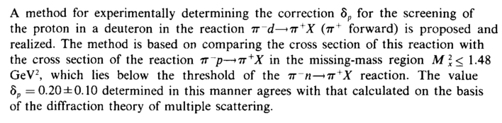 A method for experimentally determining the correction δρ for the screening of the proton in a deuteron in the reaction π d—>π+Χ (π+ forward) is proposed and realized. The method is based on comparing the cross section of this reaction with the cross section of the reaction π~ρ—>π+Χ in the missing-mass region Мгх< 1.48 GeV2, which lies below the threshold of the π~η—>π+Χ reaction. The value dp =0.20±0.10 determined in this manner agrees with that calculated on the basis of the diffraction theory of multiple scattering.
