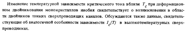 Изменение температурной зависимости критического тока вблизи Τ при деформацией-ном двойниковании монокристаллов ниобия свидетельствует о возникновении в области двойников тонких сверхпроводящих каналов. Обсуждаются также данные, свидетельствующие об аналогичной особенности зависимости IJT) в высокотемпературных сверхпроводниках.