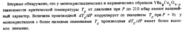 Впервые обнаружено, что у мо но кристаллически χ и керамических образцов УВа^и^О^ зависимости критической температуры Τ от давления при Ρ до 210 кбар имеют нелиней-ный характер. Величина производной dTJdP коррелирует со значением TQ при Ρ = Οι у монокристаллов с более низкими значениями Г, производная dTJdP имеет более высокое значение.