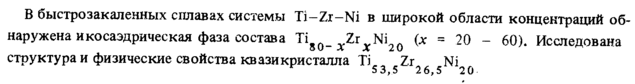 В быстрозакаленных сплавах системы Ti-Zr-Ni в широкой области концентраций обнаружена икосаэдрическая фаза состава Ti Zr Ni (χ = 20 60). Исследована структура и физические свойства кв ази кристалл a Ti Zr Ni r 53,5 26,5 20
