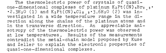 The thermoelectric power of crystals of quasi-one-dimensional complexes of platinum K2Pt (CN) i,Bro •2.3H20 (1) and K2Pt(CN) ..Clo .3'3.6H20 (2) was in" vestigated in a wide temperature range in the direction along the chains of the platinum atoms and in the transverse direction. An appreciable ani-sotropy of the thermoelectric power was observed at low temperatures. Results of the measurements contradict the metal-chain model proposed by Kuse and Zeller to explain the electronic properties of quasi-one-dimensional complexes.