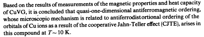 Based on the results of measurements of the magnetic properties and heat capacity of CuVG, it is concluded that quasi-one-dimensional antiferromagnetic ordering, whose microscopic mechanism is related to antiferrodistortional ordering of the orbitals of Cu ions as a result of the cooperative Jahn-Teller effect (CJTE), arises in this compound at T~ 10 K.