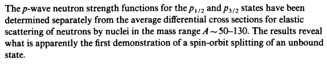 The/»-wave neutron strength functions for thepl/2 andp3/2 states have been determined separately from the average differential cross sections for elastic scattering of neutrons by nuclei in the mass range A ~ 50-130. The results reveal what is apparently the first demonstration of a spin-orbit splitting of an unbound state.