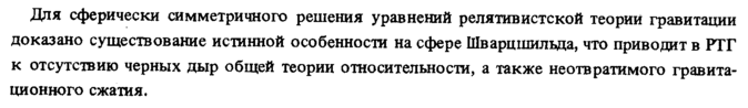 Для сферически симметричного решения уравнений релятивистской теорий гравитации доказано существование истинной особенности на сфере Шварцшильда, что приводит в РТГ к отсутствию черных дыр общей теории относительности, а также неотвратимого гравитационного сжатия.