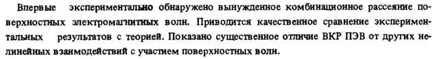 Впервые экспериментально обнаружено вынужденное комбинационное рассеяние поверхностных электромагнитных волн. Приводится качественное сравнение экспериментальных результатов с теорией. Показано существенное отличие ВКР ПЭВ от других нелинейных взаимодействий с участием поверхностных волн.