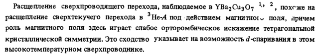 Расщепление сверхпроводящего перехода, наблюдаемое в YBa2Cu307 l f 2 f похоже на расщепление сверхтекучего перехода в 3Hevt под действием магнитное поля, причем роль магнитного поля здесь играет слабое орторомбическое искажение тетрагональной кристаллической симметрии. Это сходство указывает на возможность d-спаривания в этом высокотемпературном сверхпроводнике.
