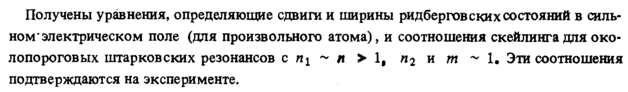 Получены уравнения, определяющие сдвиги и ширины ридберговских состояний в сильном "электрическом поле (для произвольного атома), и соотношения скейлинга для околопороговых штарковских резонансов с п± ~ η > 1, η<ι и т *~ 1. Эти соотношения подтверждаются на эксперименте.