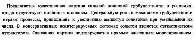 Предлагается качественная картина сильной волновой турбулентности в условиях, когда отсутствуют волновые коллапсы. Центральную роль в механизме турбулентности играют процессы, приводящие к увеличению амплитуд со ли тонов при уменьшении их числа. В консервативных неинтегрируемых системах со ли тон является статистическим аттрактором. Описанная картина подтверждается прямым численным моделированием.