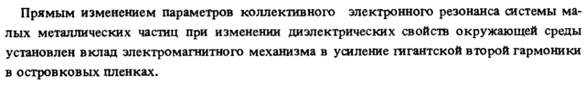 Прямым изменением параметров коллективного электронного резонанса системы малых металлических частиц при изменении диэлектрических свойств окружающей среды установлен вклад электромагнитного механизма в усиление гигантской второй гармоники в островковых пленках.