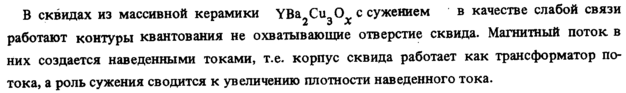 В сквидах из массивной керамики YBa„Cu О с сужением в качестве слабой связи работают контуры квантования не охватывающие отверстие сквида. Магнитный поток в них создается наведенными токами, т.е. корпус сквида работает как трансформатор потока, а роль сужения сводится к увеличению плотности наведенного тока.