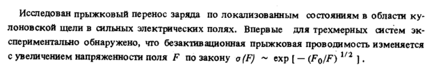 Исследован прыжковый перенос заряда по локализованным состояниям в области кулонов ской щели в сильных электрических полях. Впервые для трехмерных систем экспериментально обнаружено, что безактиванионная прыжковая проводимость изменяется с увеличением напряженности поля F по закону o(F) ~ ехр [ — (F0/F)1/2 ].
