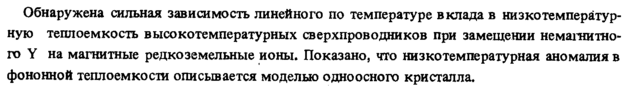 Обнаружена сильная зависимость линейного по температуре вклада в низкотемпературную теплоемкость высокотемпературных сверхпроводников при замещении немагнитного Υ на магнитные редкоземельные ионы. Показано, что низкотемпературная аномалия в фононной теплоемкости описывается моделью одноосного кристалла.