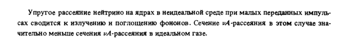 Упругое рассеяние нейтрино на ядрах в неидеальной среде при малых переданных импульсах сводится к излучению и поглощению фононов. Сечение иА -рассеяния в этом случае значительно меньше сечения М-рассеяния в идеальном газе.