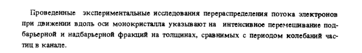 Проведенные экспериментальные исследования перераспределения потока электронов при движении вдоль оси монокристалла указывают на интенсивное перемешивание под-барьерной и надбарьерной фракций на толщинах, сравнимых с периодом колебаний частиц в канале.